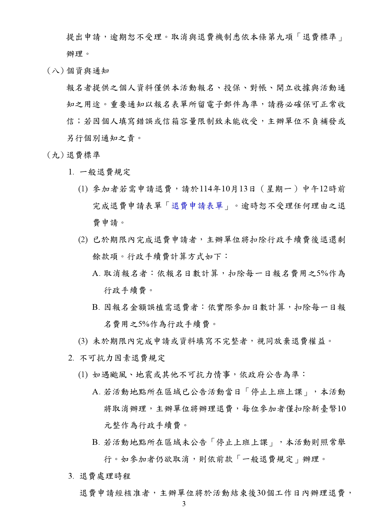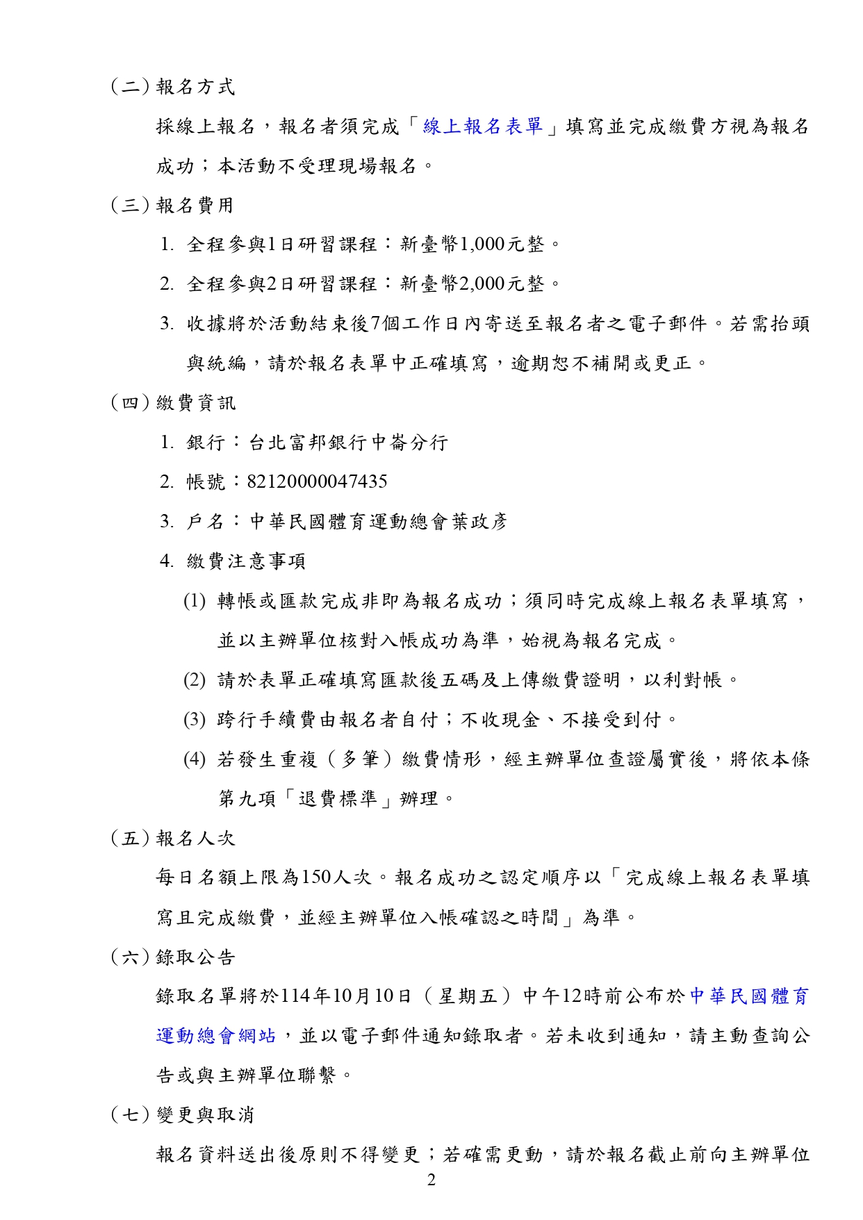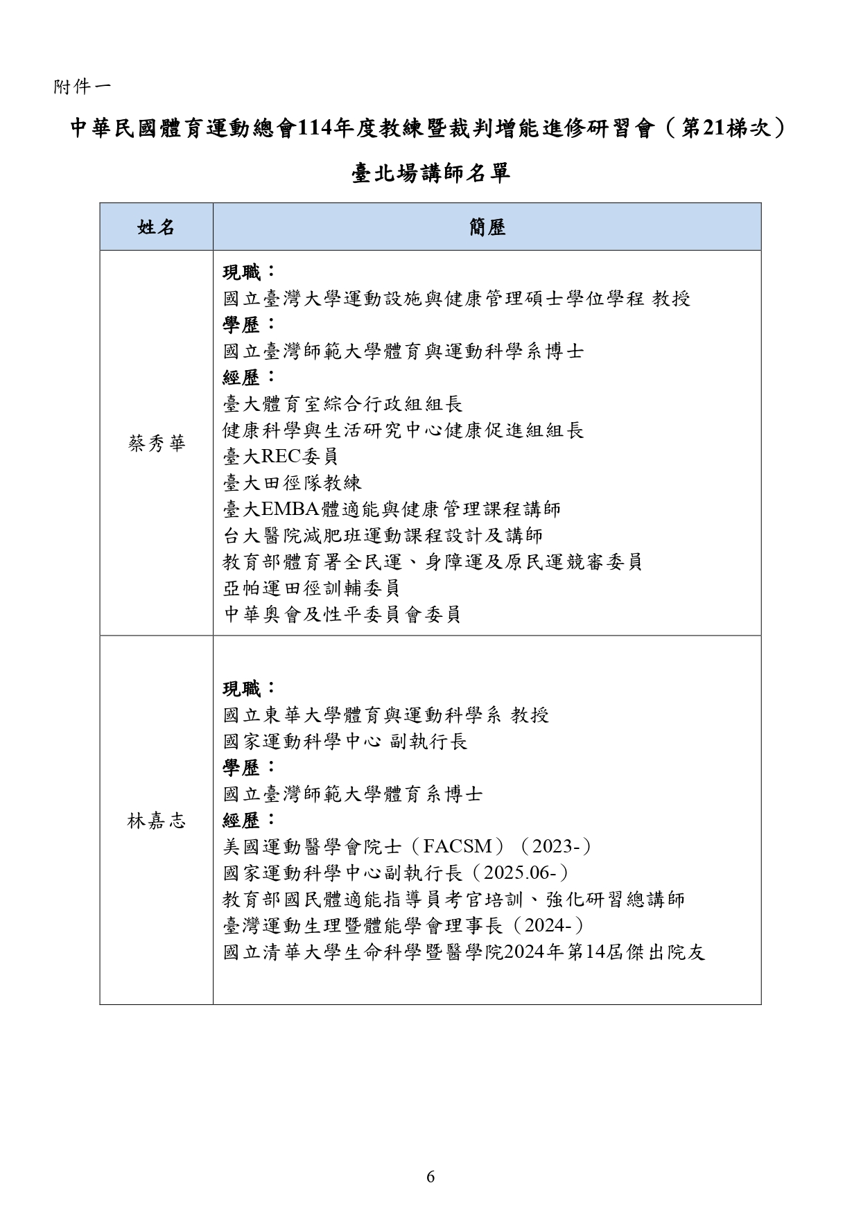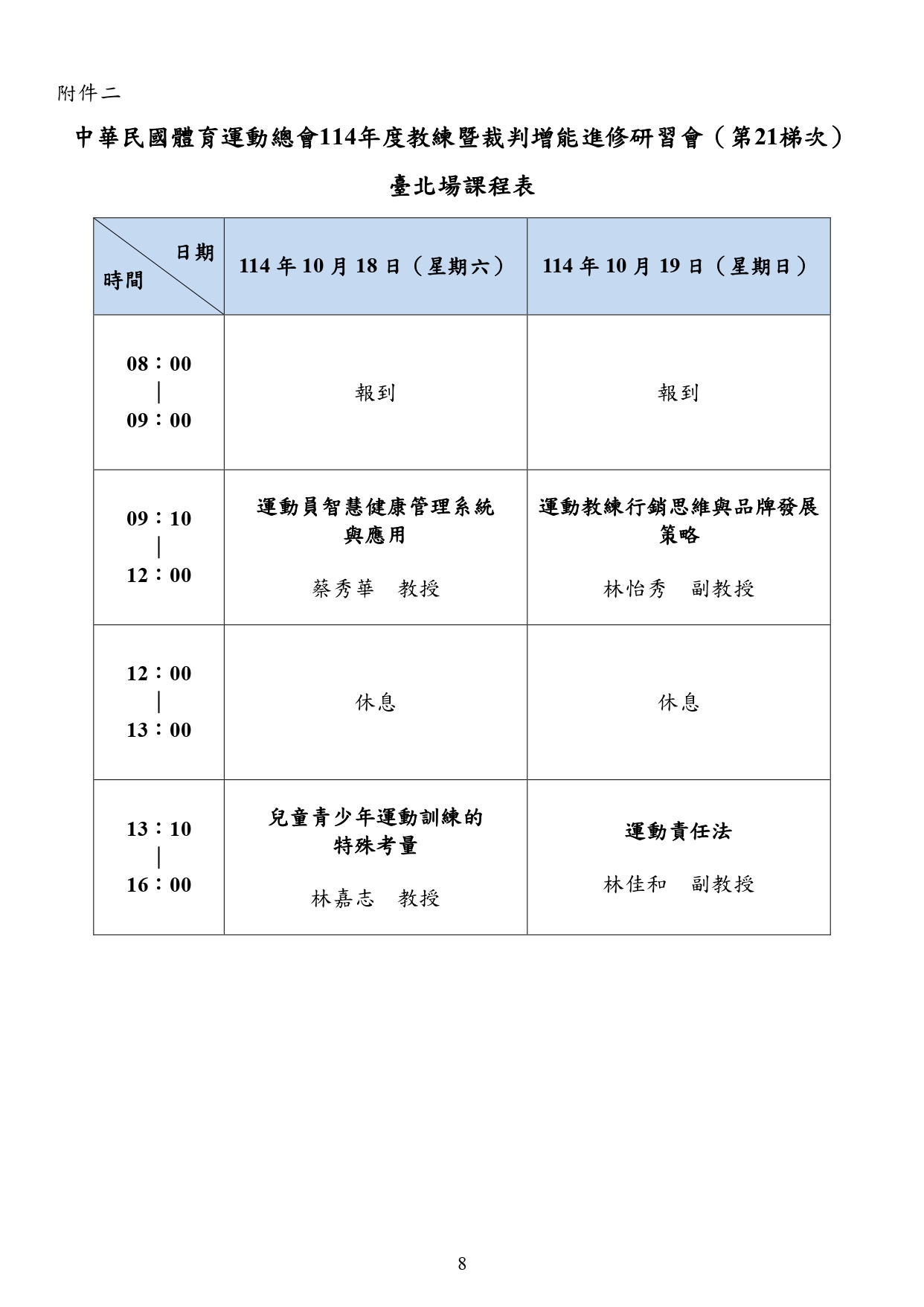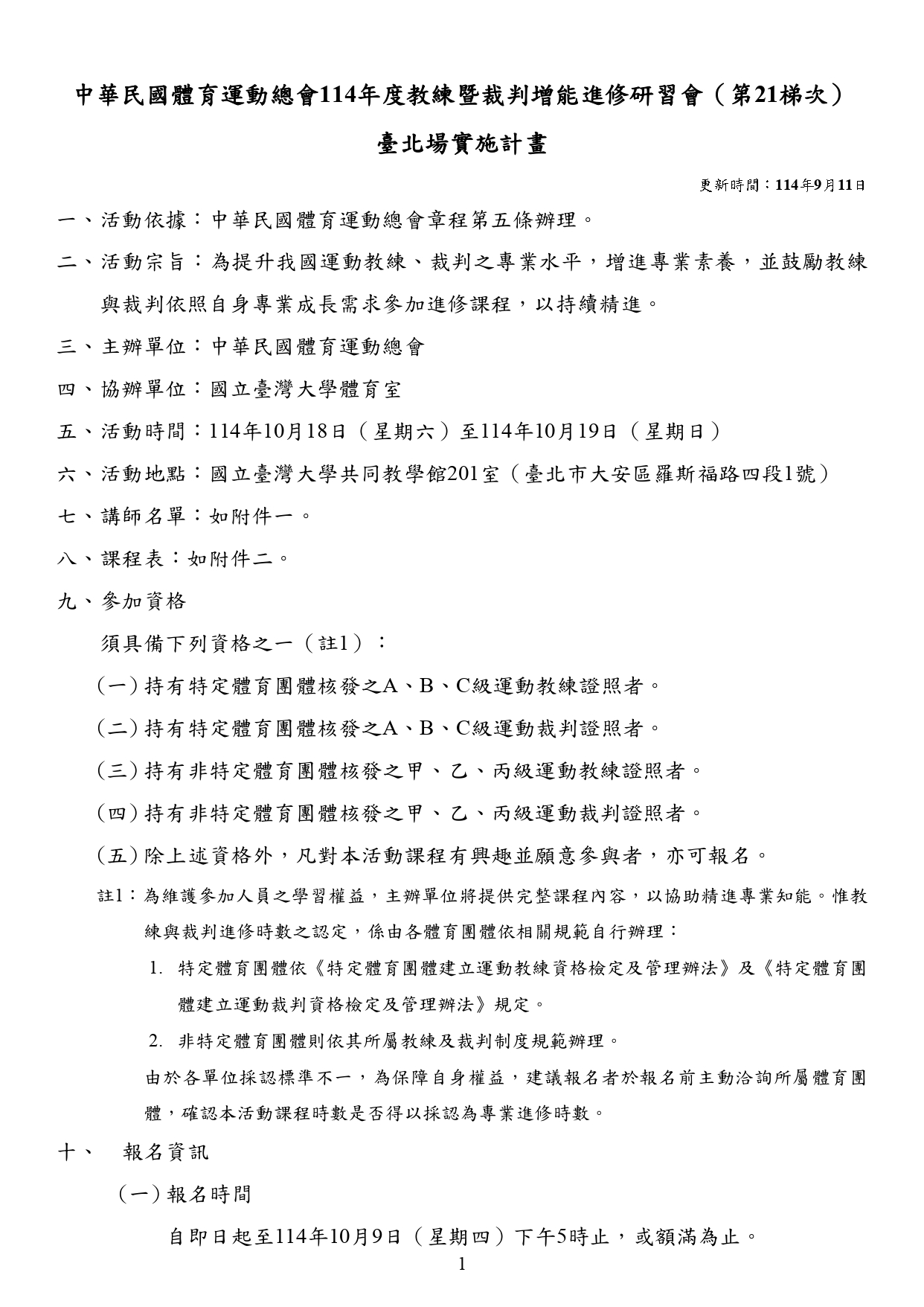 公告消息 轉公告-114年教練暨裁判增能進修研習會(第21梯次)臺北場 By - 2025/09/16 162 0 SHARE Facebook Twitter 相關檔案 # 檔案下載 檔案名稱 1 體總輔字第1140002477號.pdf 2 體總輔字第1140002477號-附件1.pdf