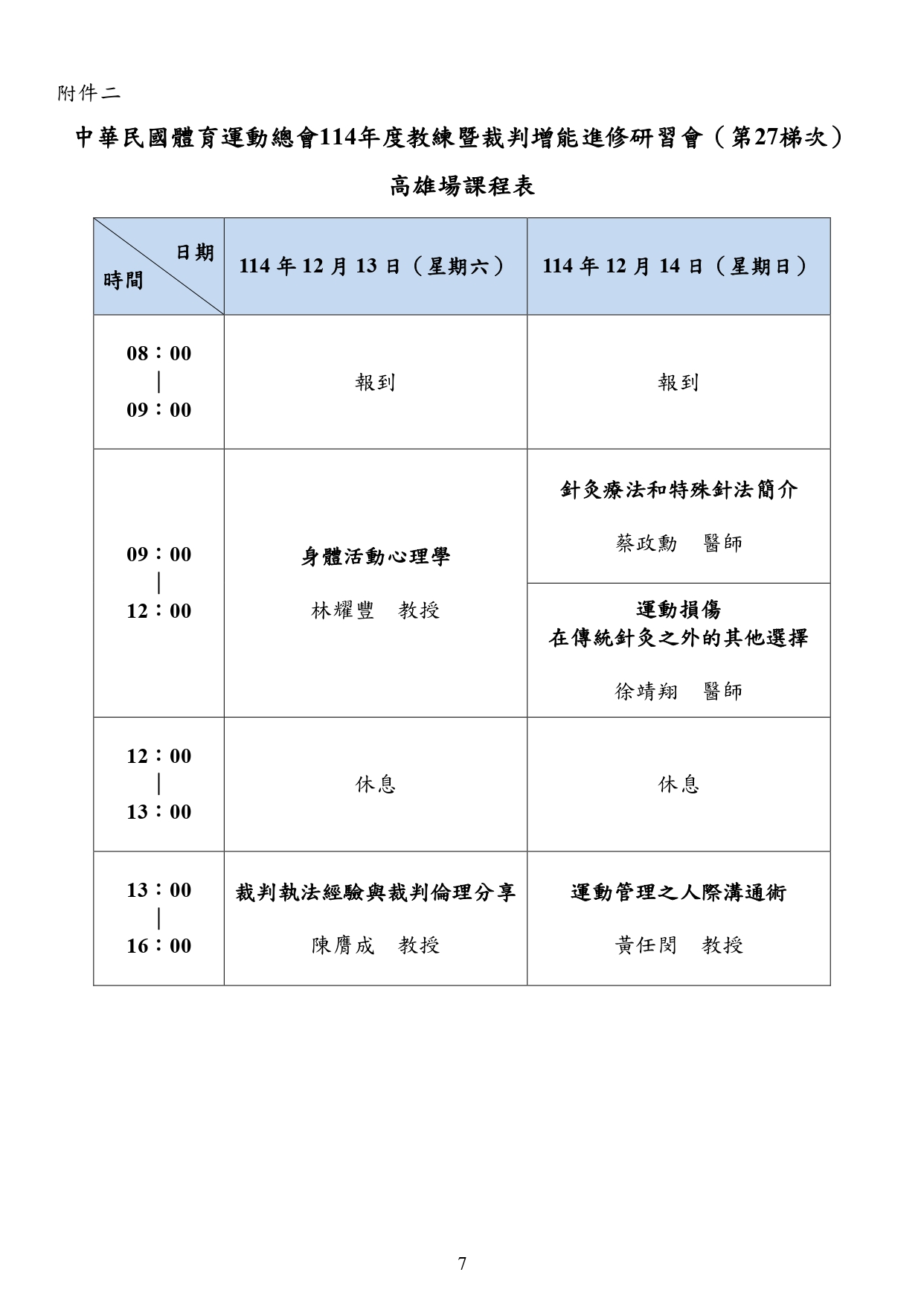 公告消息 轉公告-114年教練暨裁判增能進修研習會(第27梯次)高雄場 By - 2025/11/10 65 0 SHARE Facebook Twitter 詳細活動辦法與實施計畫於檔案下載區附件 相關檔案 # 檔案下載 檔案名稱 1 體總輔字第1140003021號-附件.pdf