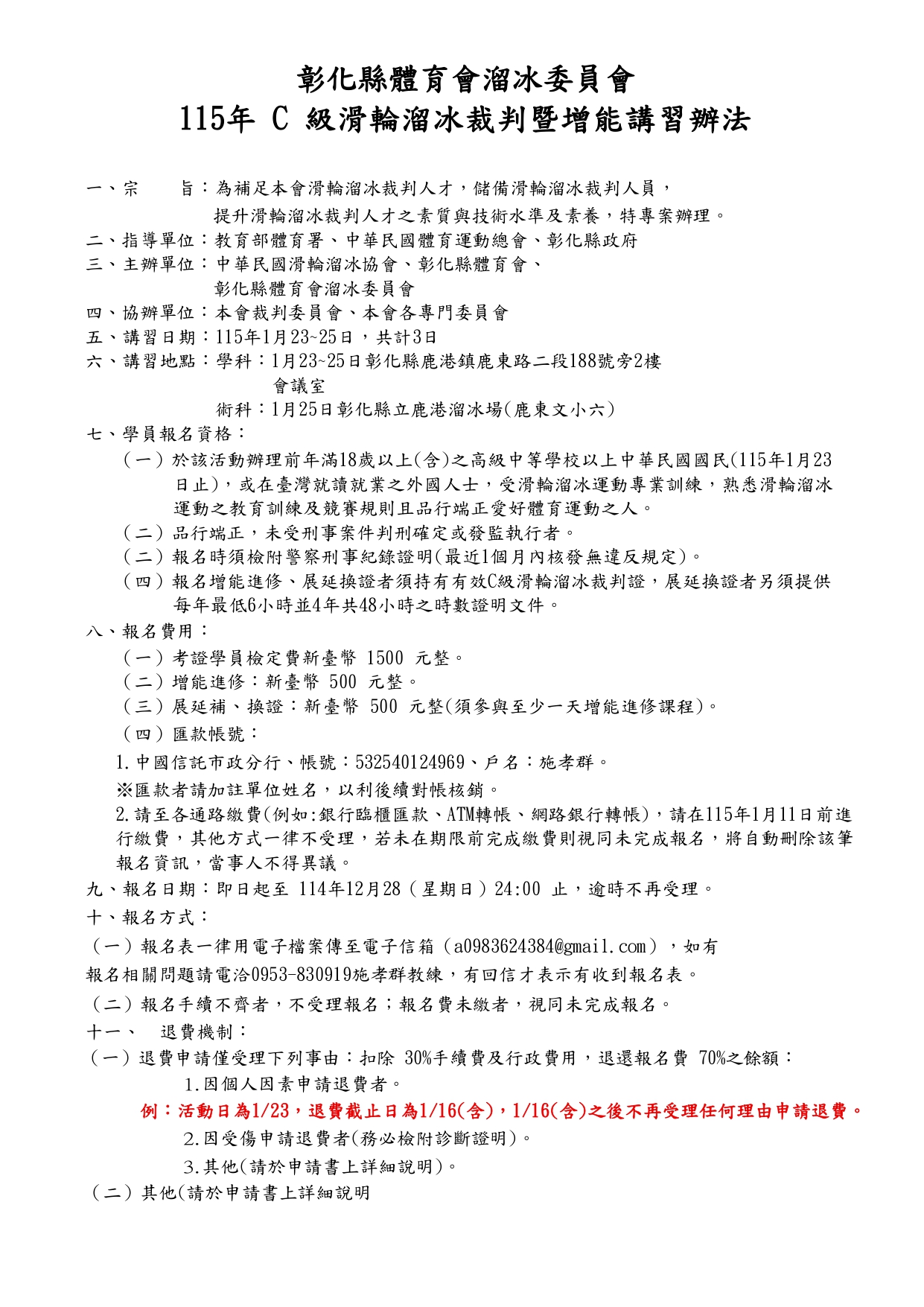 裁判專區 公告消息 轉公告-115年彰化縣滑輪溜冰C級裁判暨增能講習(草案) By - 2025/12/22 34 0 SHARE Facebook Twitter 相關報名問題請洽活動章程聯繫人:施孝群教練 相關檔案 # 檔案下載 檔案名稱