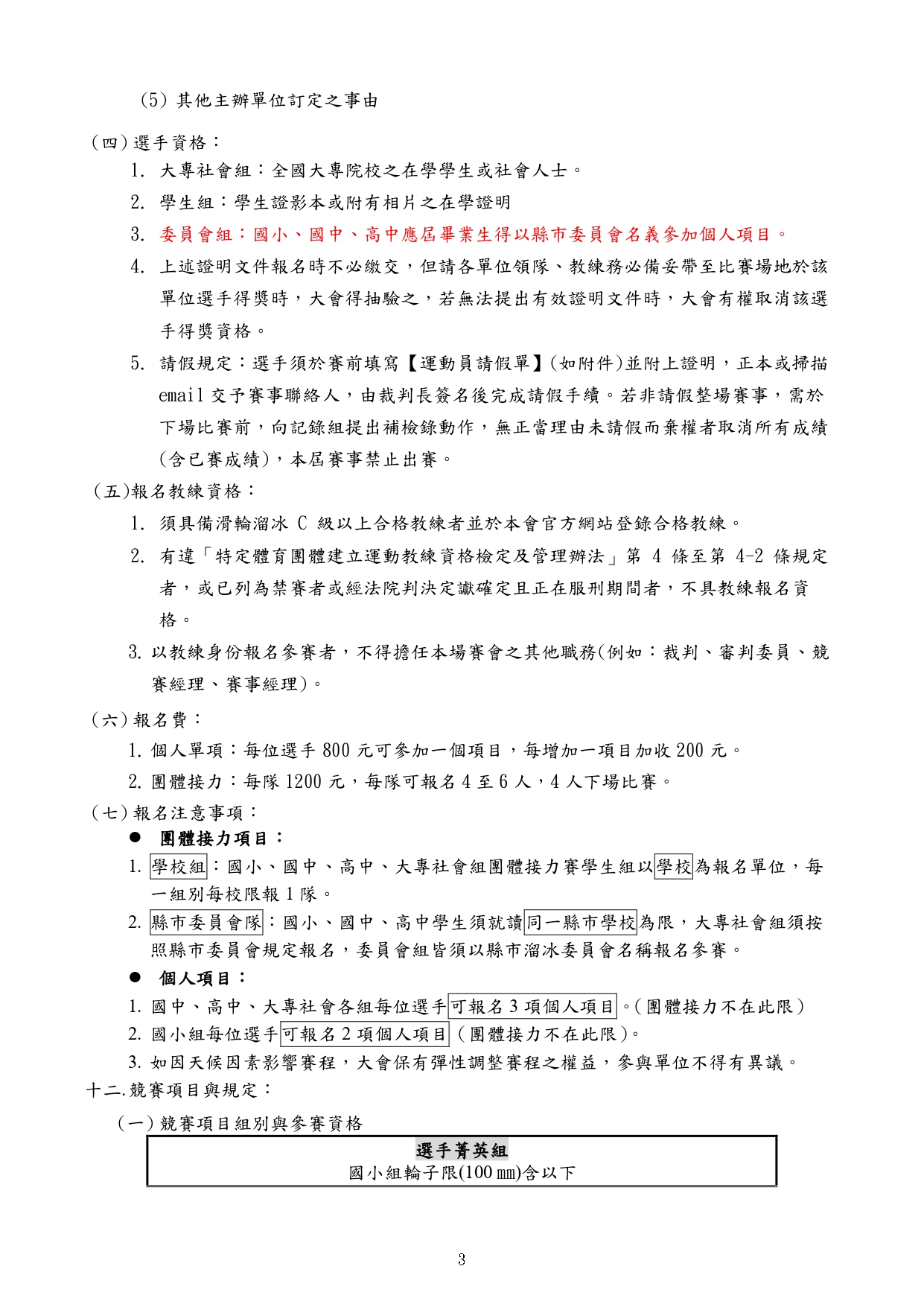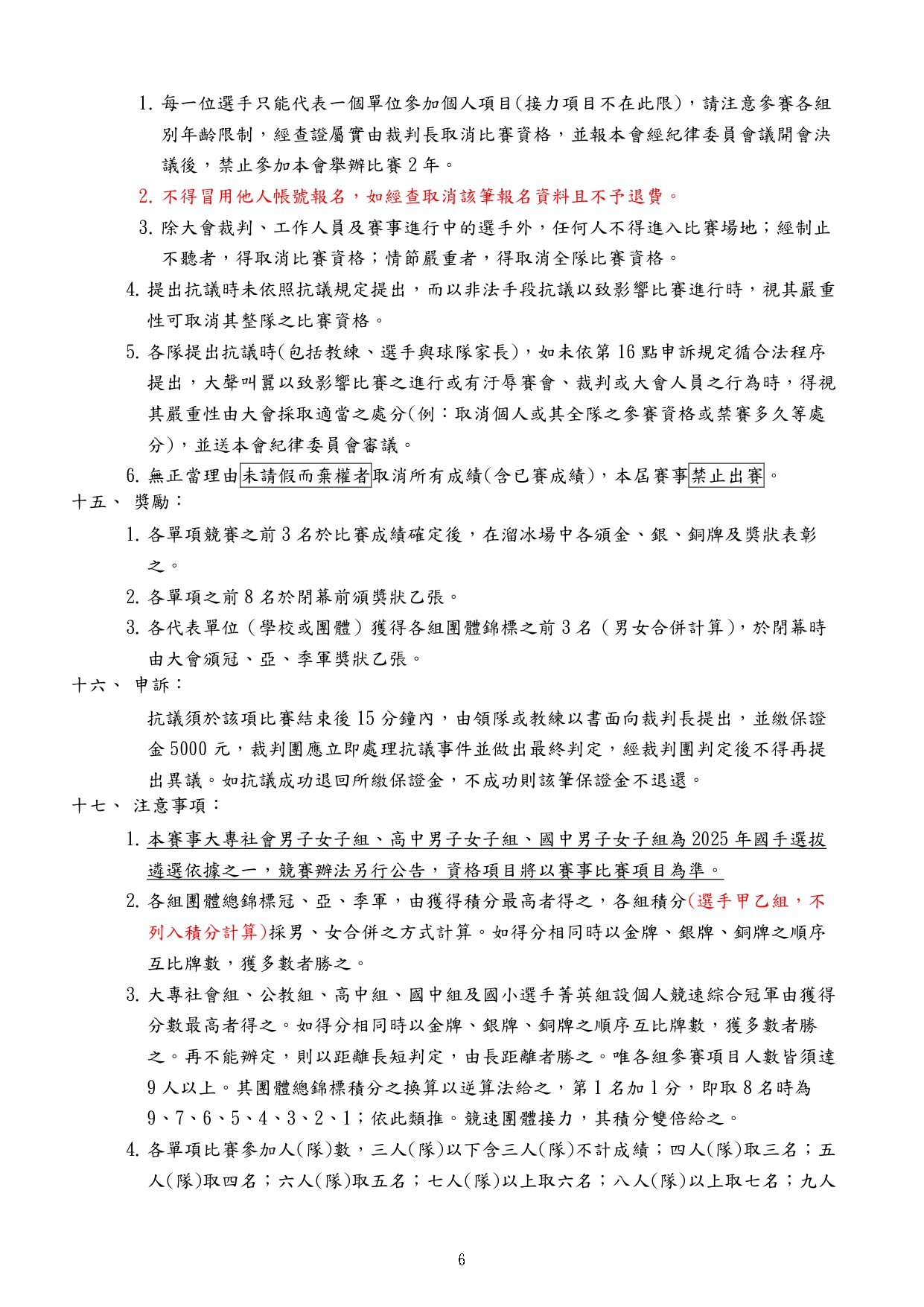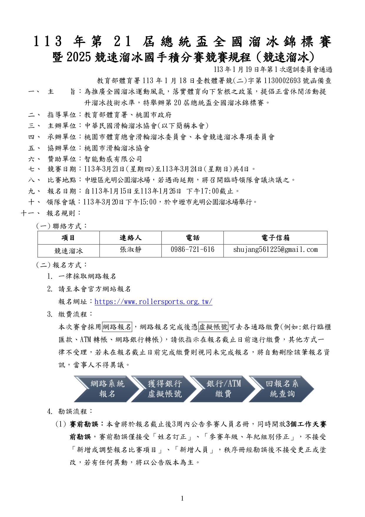 最新 項目 公告消息 競速溜冰 113年第21屆總統盃全國溜冰錦標賽(競速溜冰)委員組報名從這裡! By - 2024/01/08 5819 0 SHARE Facebook Twitter 報名時間: 2024/01/15 ~ 2024/01/30 報名去 委員組報名截止日期為113年1月30日 17:00止 (1月16日更新) 相關檔案 # 檔案下載 檔案名稱 1 113年第21屆總統盃-競速秩序冊-網路公告版.pdf 2 臺教體署競(二)字第1130002693號.pdf 3 發-各縣市溜委會.pdf 4 發-各縣市教育局.pdf 5 113年第21屆總統盃全國溜冰錦標賽暨2025競速溜冰國手積分賽競賽規程(競速溜冰).pdf 6 退費申請書(賽事、研習).docx