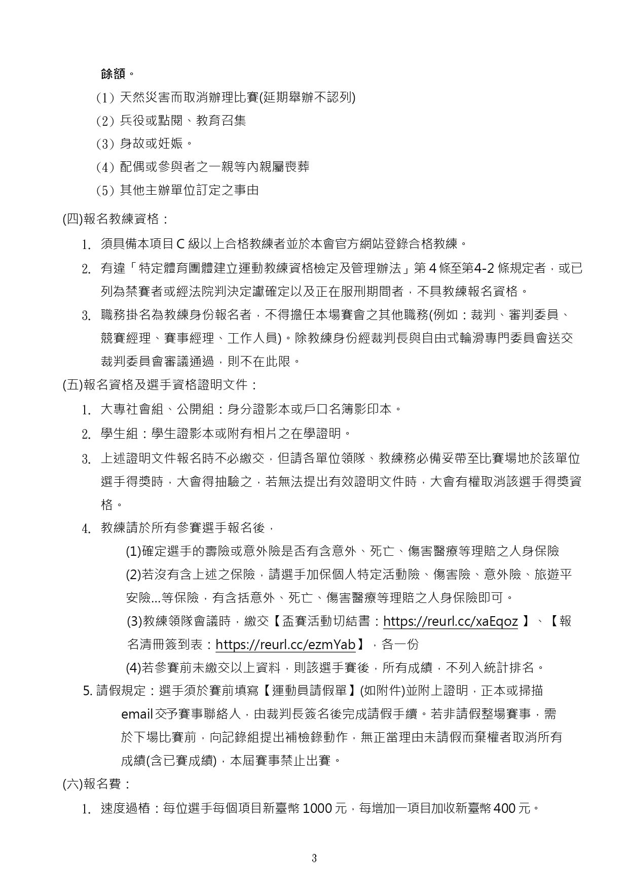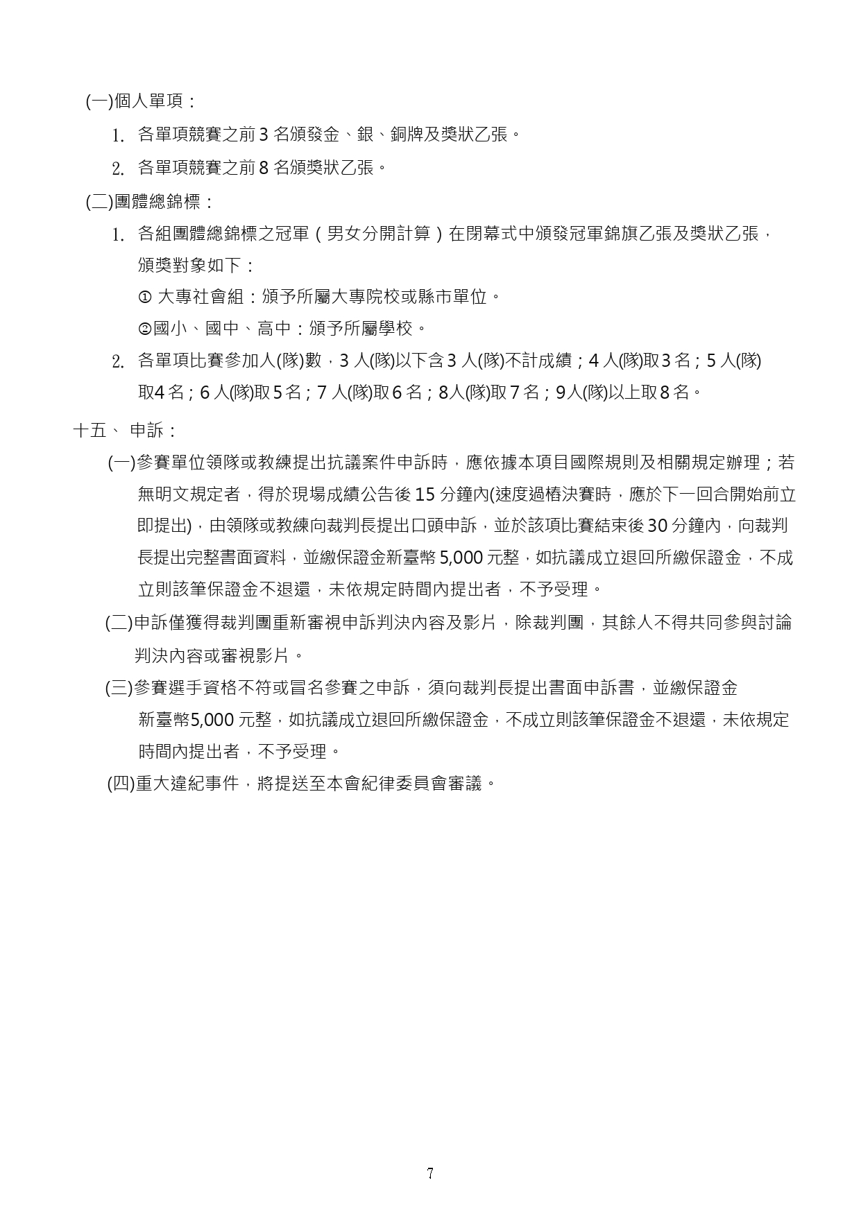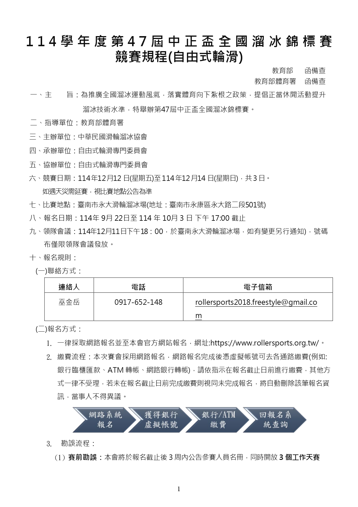 最新 項目 自由式輪滑 公告消息 114學年度第47屆中正盃全國溜冰錦標賽(自由式輪滑)(學校組報名從這裡!)-草案 By - 2025/09/18 1845 0 SHARE Facebook Twitter 報名時間: 2025/09/22 ~ 2025/10/03 報名去 相關檔案 # 檔案下載 檔案名稱 1 退費申請書(賽事、研習).docx