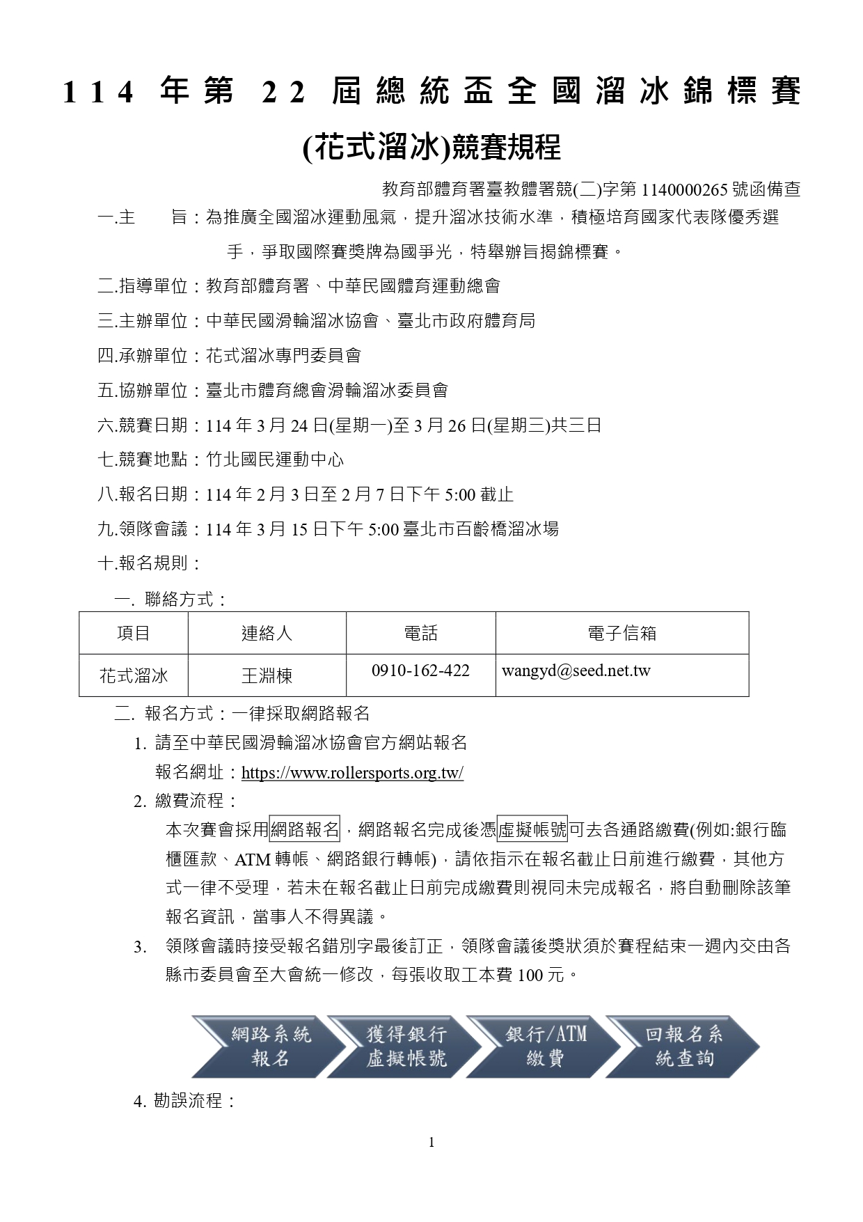最新 項目 運動消息 公告消息 花式溜冰 114年第22屆總統盃全國溜冰錦標賽(花式溜冰)委員組報名 By - 2025/01/10 1744 0 SHARE Facebook Twitter 報名時間: 2025/02/03 ~ 2025/02/07 報名去 相關檔案 # 檔案下載 檔案名稱 1 114年第22屆總統盃全國溜冰錦標賽花式溜冰秩序冊-網路公告版.pdf 2 中溜財字第1145010015號-滑輪各縣市教育局(處).pdf 3 114年第22屆總統盃全國溜冰錦標賽(花式溜冰)-核備.pdf 4 退費申請書(賽事、研習).docx 5 臺教體署競(二)字第1140000265號-核備.pdf